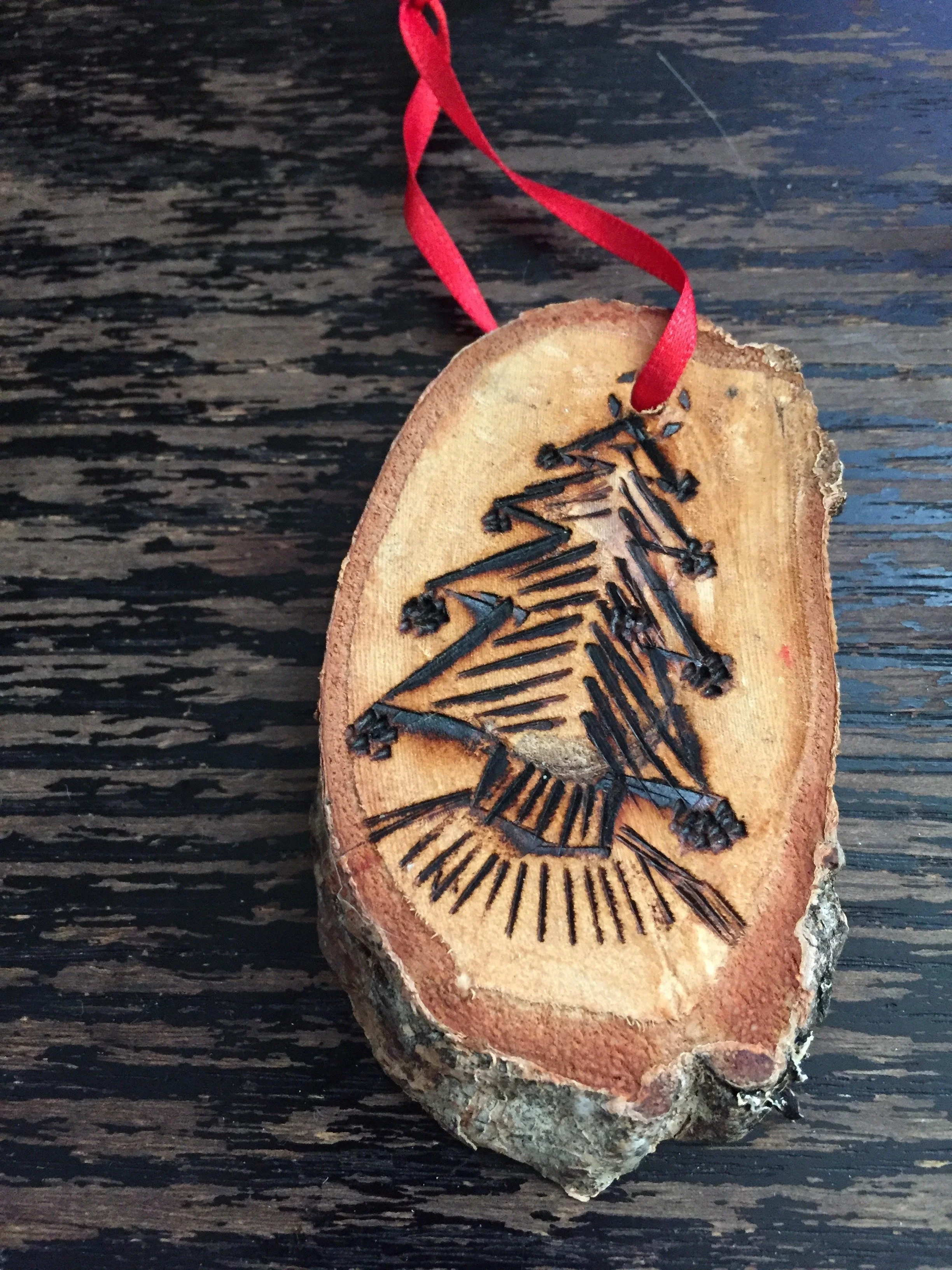 With wood burning kits, we made lovely ornaments with etched snowflakes and other designs on cut rounds of a birch branch. The kids got to help cut the rounds too with a power saw.